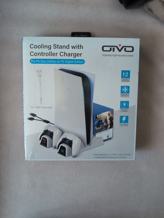 Detalles del productoSoporte OVO para PS5 (edición disco y digital). Incluye dos bases para cargar mandos. Está en perfectas condiciones.