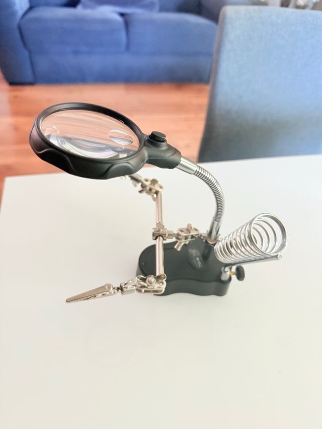 Detalles del productoMagnifica herramienta de ayuda para soldar circuitos. Incluye una lupa con luz y un soporte con pinzas. Está en muy buen estado y es perfecta para trabajos de precisión.