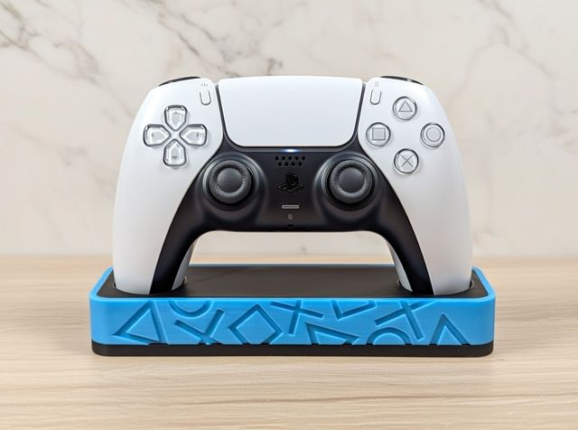 Soporte para mando de PlayStation 5. - Diseño moderno en color azul y negro. - Base con motivos de los botones de PlayStation.