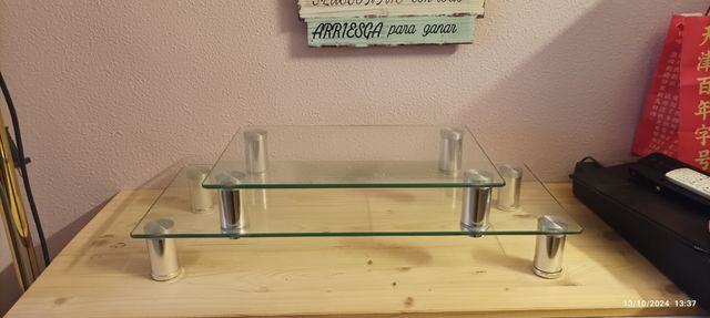 Detalles del productoBase soporte estructura de cristal dos alturas. Se puede desmontar y poner por separado. Pastas de aluminio desmontable. Cristales biselados canteados. Medidas; 60x26x8 y 39x26x8