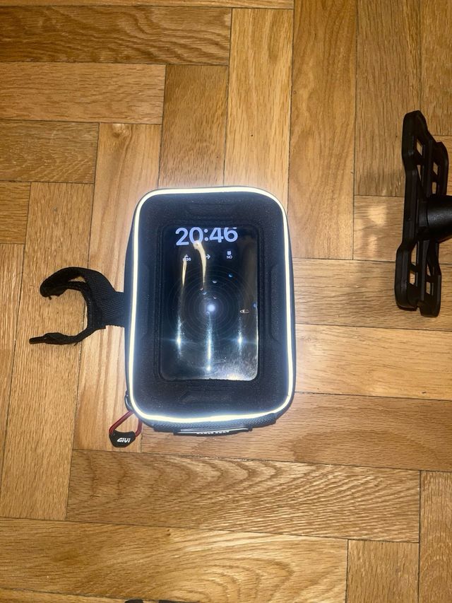 Soporte Givi para llevar el movil en la moto. La foto inicial de ha hecho con un iphone 13 dentro de la funda.