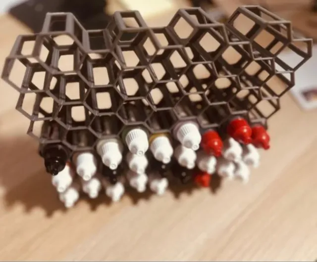 Práctico soporte hexagonal para organizar tus pinturas. - Diseño modular y apilable. - Material resistente y duradero. - Ideal para botes de pintura