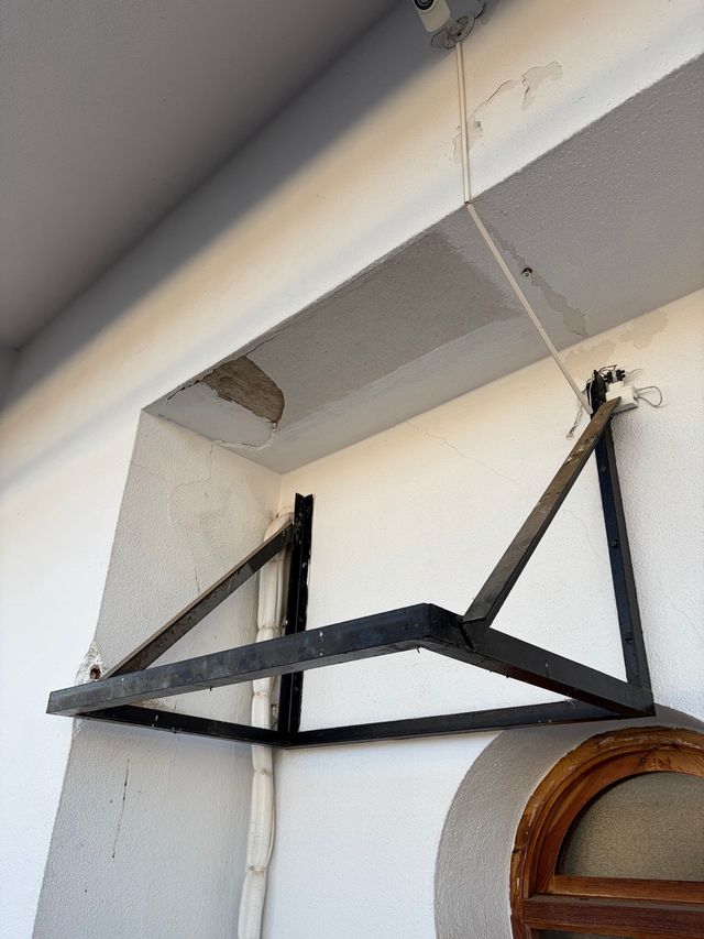 Soporte de metal con diseño triangular. - Estructura robusta de color negro. - Ideal para colgar objetos o como base.