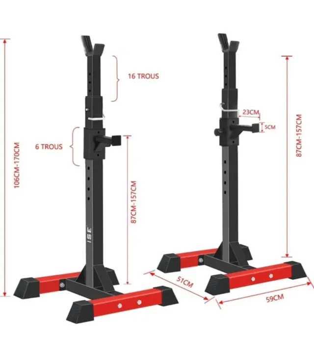 Fácil de ajustar,se adapta a varios tamaños de mancuernas Ajuste de alt :Ajuste de altura completo de 16 niveles,ajuste de alt de 6 niveles de la mancuerna Ajuste de la altura del soporte de mancuernas en 6 niveles Altura total : de 104 a 175 cm -