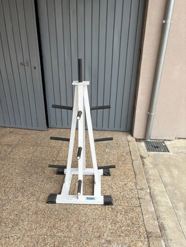 Detalles del productoSoporte vertical para organizar discos de pesas de gimnasio. Estructura blanca de metal.