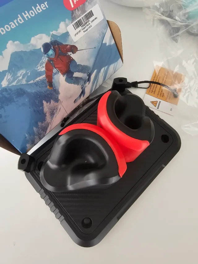 Soporte para esquís de pared, ideal para organizar tu equipo. - Diseño en color negro y rojo. - Material resistente. Nuevo a estrenar