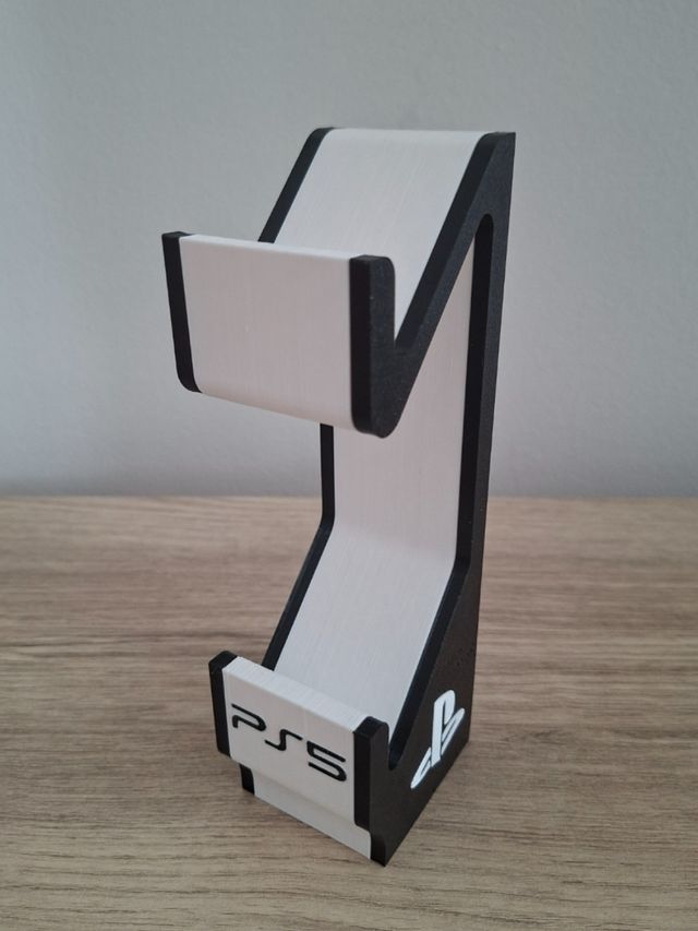 Detalles del productoSoporte diseñado para mandos de PlayStation 5. Presenta un acabado bicolor en blanco y negro, con el logo de PS5 y el símbolo de PlayStation.