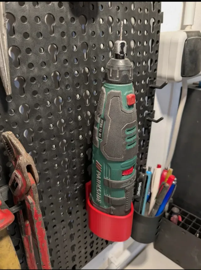 Detalles del productoSoporte de pared para mini taladro Parkside. Fabricado en plástico rojo resistente.