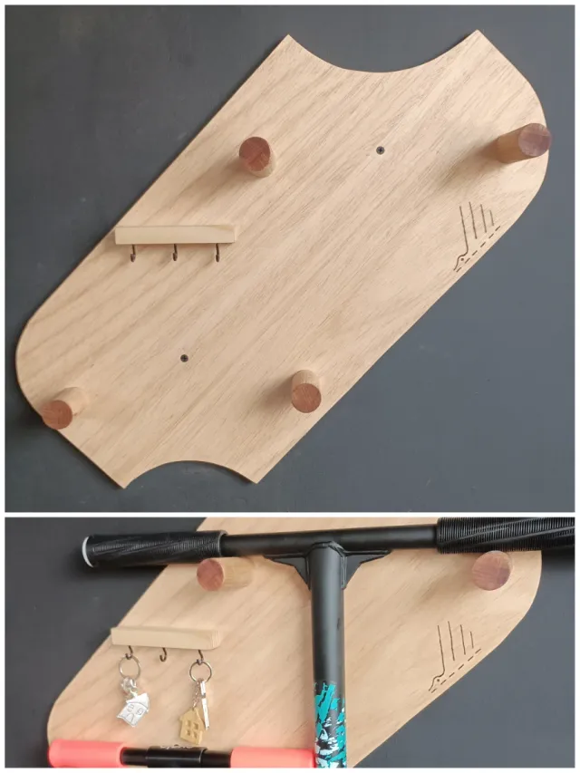 Soporte/gancho/estante doble de pared para patinetes,de madera contrachapada barnizada,ligero y resistente.Manufacturados.