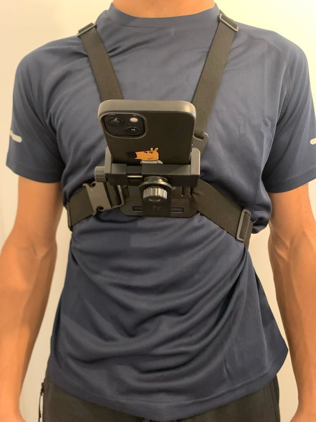 Soporte para móvil que se ajusta al pecho mediante correas. - Correas ajustables. - Soporte para teléfono. - Hebilla de liberación rápida.