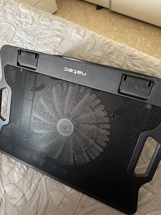 Base refrigeradora para portátil con ventilador. - Diseño en malla metálica negra. - Dos soportes de sujeción para el portátil. - Logo de la marca en la parte superior.