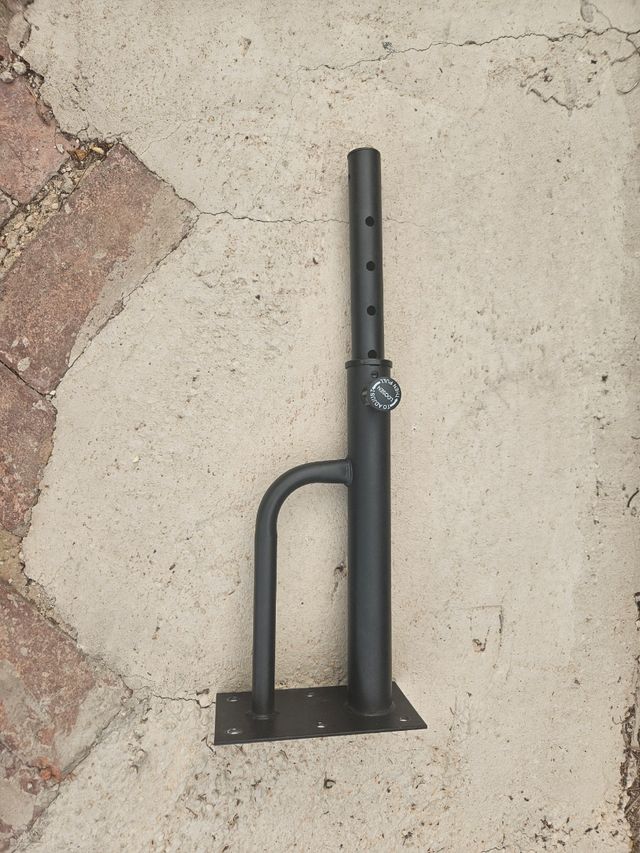 Detalles del productoSoporte metálico negro para saco de boxeo con base y ajuste para sacar el brazo más o recogerlo.
