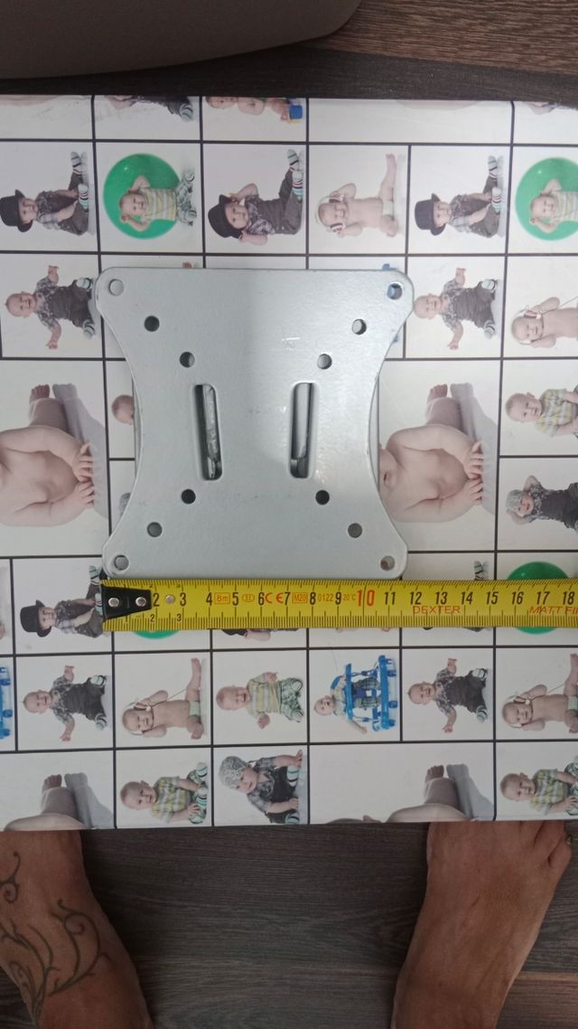 Soporte de pared para televisor. Es de color plata y parece estar en buen estado. - Medidas aproximadas: 10 cm x 10 cm. - Material: Metal.