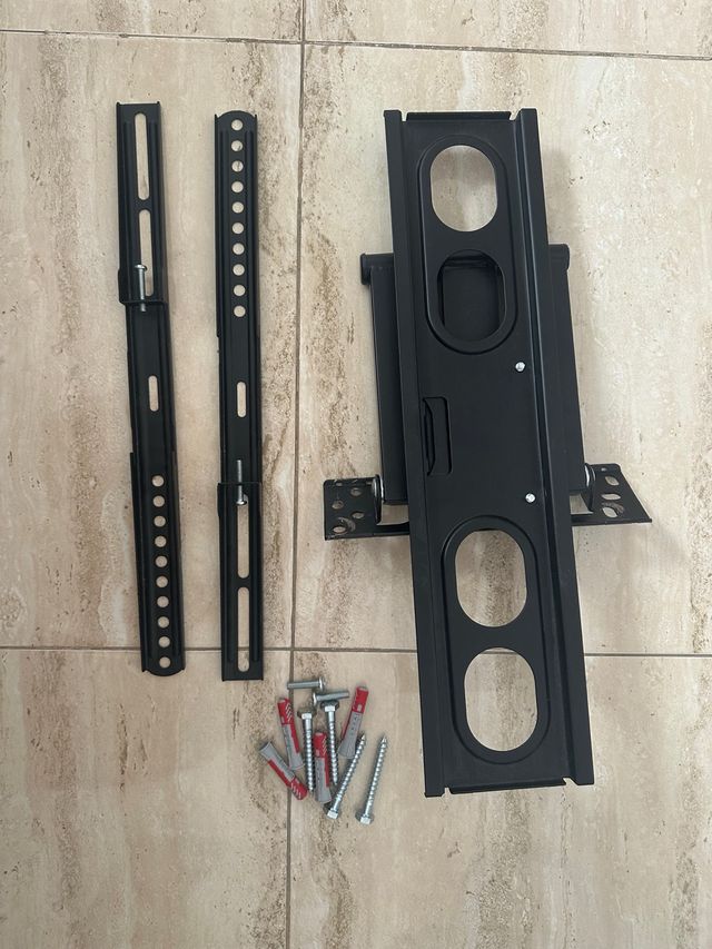 Soporte de pared para televisión en color negro. - Incluye dos barras de montaje. - Incluye tornillería y tacos para instalación.