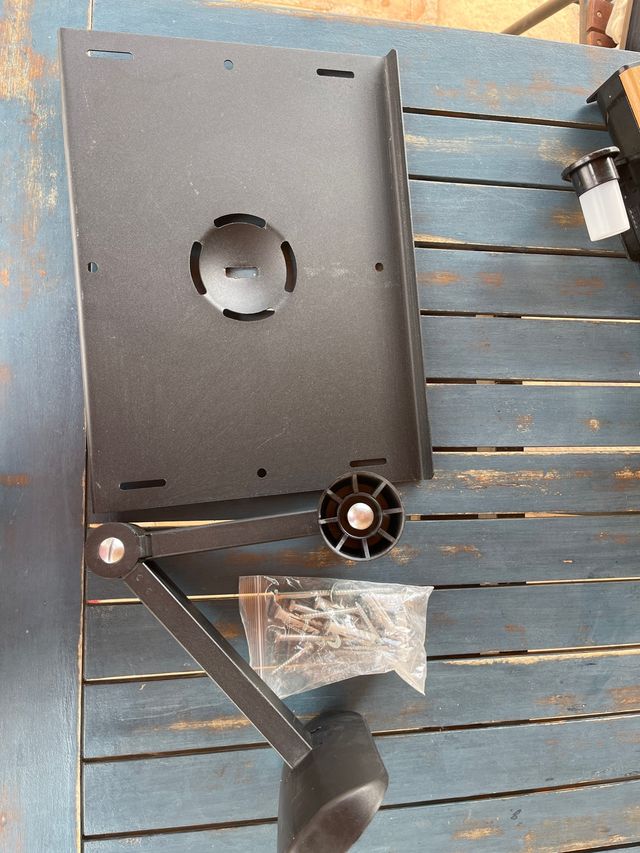 Soporte de pared para TV en color negro. Incluye brazo articulado y tornillería. - Placa de montaje para TV. - Brazo articulado con ajuste. - Bolsa de tornillos y tacos.