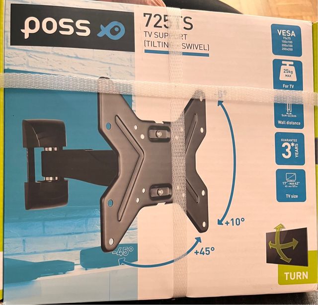 Detalles del productoSoporte de pared para TV Poss 725S, en perfecto estado. Es un soporte inclinable y giratorio, ideal para una mejor visualización.