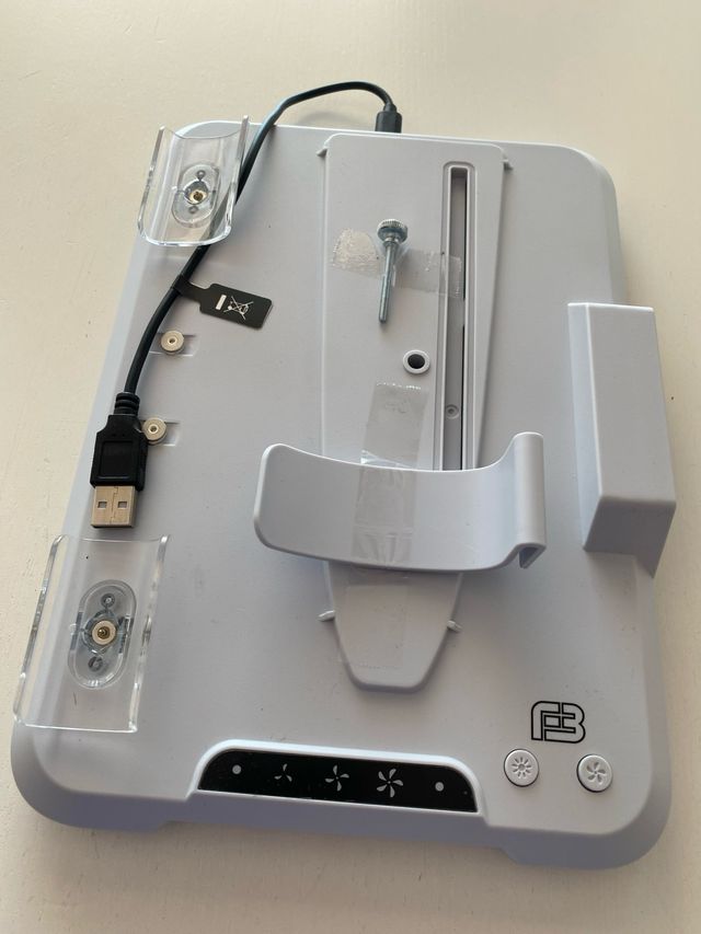 Detalles del productoSoporte vertical para PlayStation 5, en color blanco y en buen estado. Incluye dos ventiladores para refrigeración y un soporte para los mandos, tambien lleva soporte auriculares. Se entrega con cable USB y tornillos. Ideal para mantener tu consola organizada y fresca.