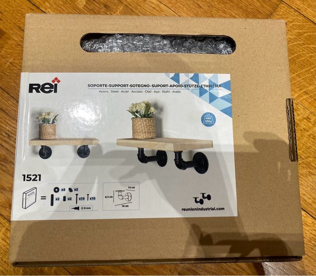 Detalles del productoSet de soportes para estantería con un diseño industrial inspirado en tuberías.