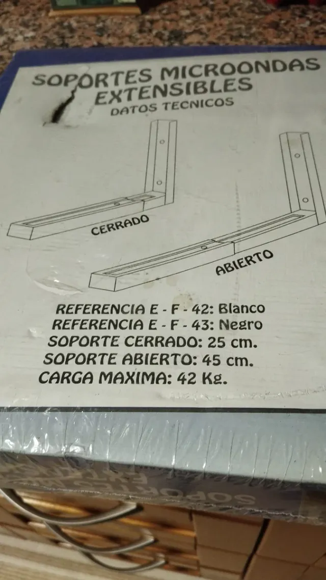Soportes extensibles para microondas. - Referencia E-F-42: Blanco - Soporte cerrado: 25 cm. - Soporte abierto: 45 cm. - Carga máxima: 42 Kg.