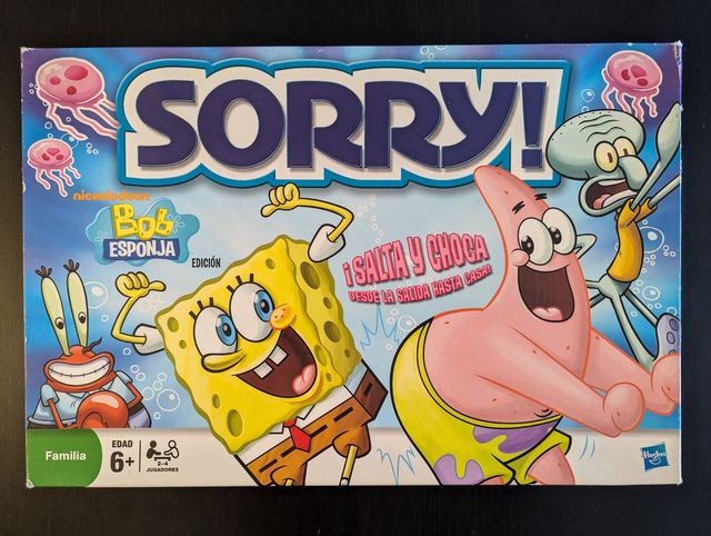 Juego de mesa Sorry! versión de Bob Esponja. Con todo en muy buen estado salvo la caja, que está bastante dañada.