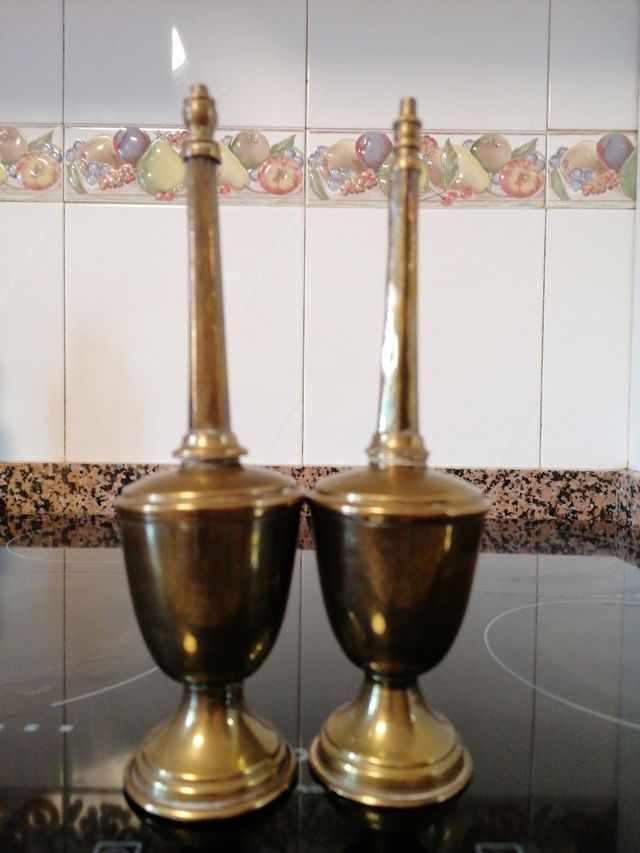 Detalles del productoPar de objetos decorativos de bronce, con un diseño inspirado en Marruecos. Son ideales para añadir un toque de elegancia a cualquier espacio.