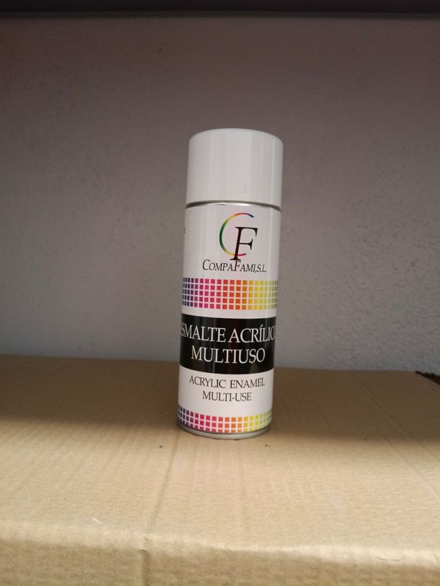 Detalles del productoSpray de esmalte acrílico multiusos de la marca Compafamis,S.L. Es un bote de pintura en spray de color blanco, nuevo y sin usar. 10 unidades en stock.