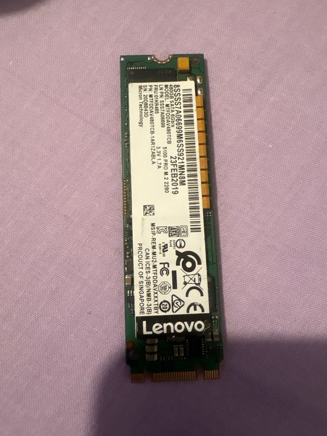 Disco de estado sólido Lenovo de 480GB en formato M.2 2280. - Capacidad: 480GB - Interfaz: SATA 6Gb/s - Modelo: MTFDDAV480TCB - Fabricado en Singapur