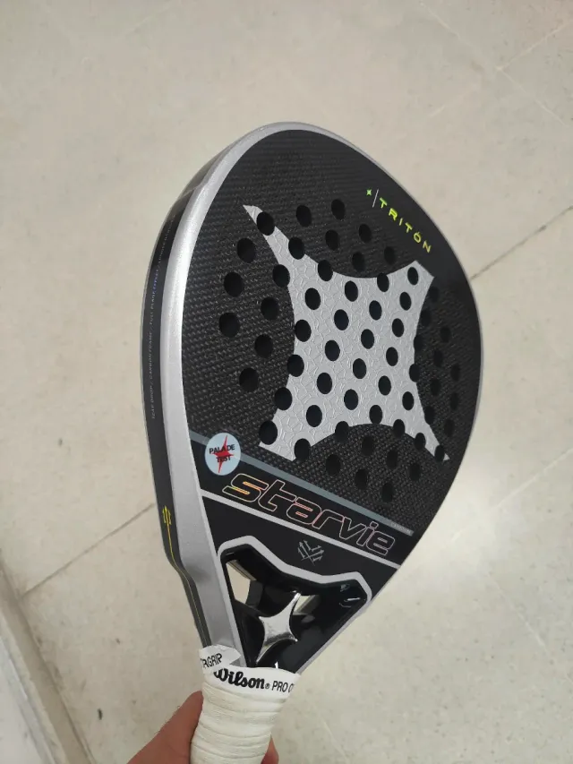 Pala de pádel Star Vie Tritón Pro con acabado en carbono. - Diseño con detalles en plateado y negro. - Superficie con agujeros. - Grip Wilson Pro.