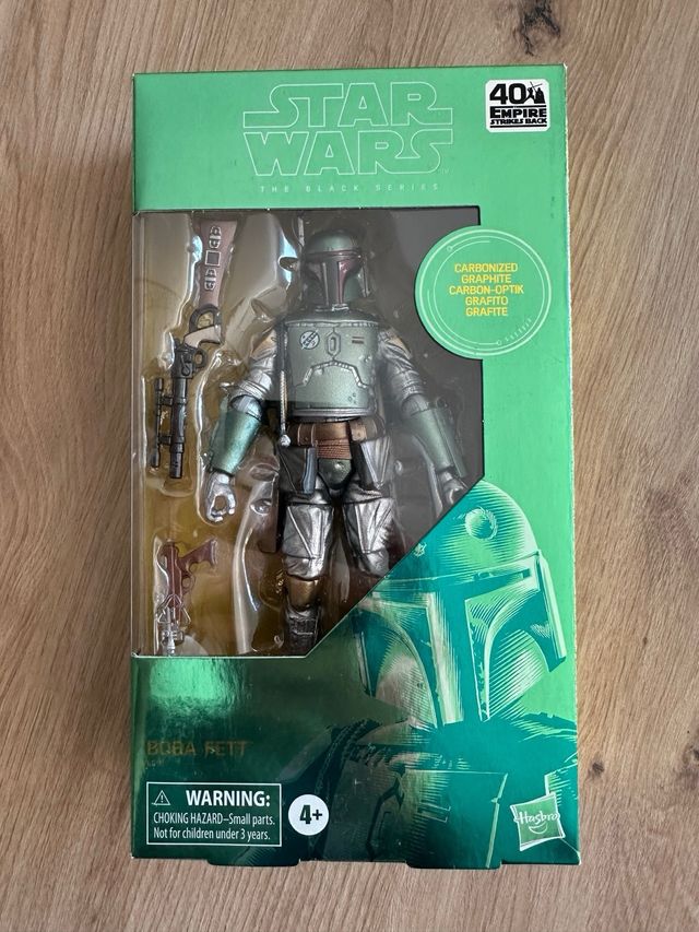 Detalles del productoblister de Star wars de las black series de 6“ pulgadas de tamaño, la figura de Boba Fett Carbonized Edicion 40 aniversario Empire Strikes Back, esta sin abrir y es original de Hasbro