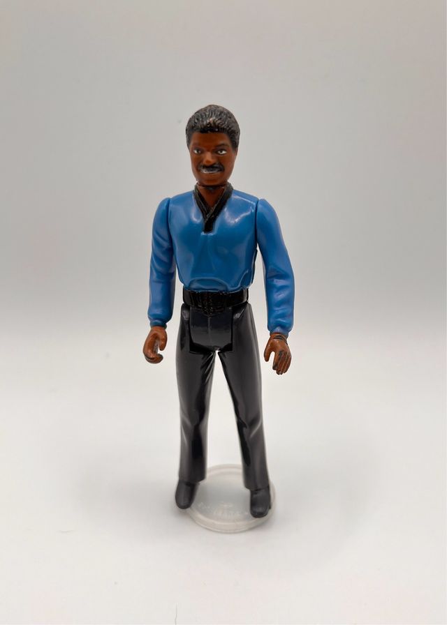 Figura vintage de Lando Calrissian de Star Wars. - Traje azul y pantalones negros. - Detalle de cinturón negro. - Soporte transparente incluido.