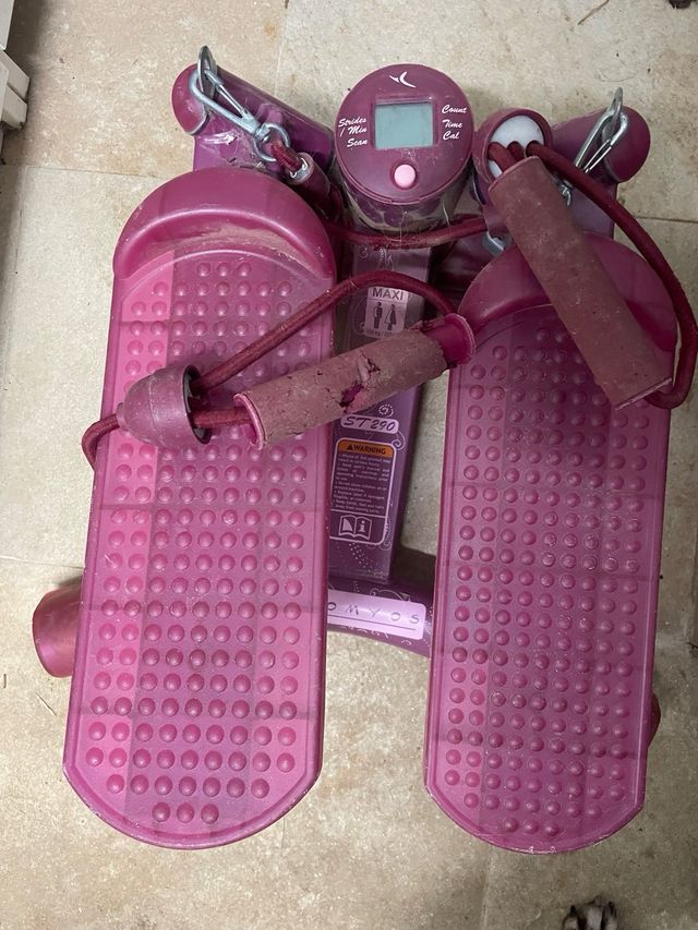 Stepper Domyos color magenta. Funciona perfectamente. Tiene una de las almohadillas deteriorada. Se podria cambiar, pero de ahí su precio.