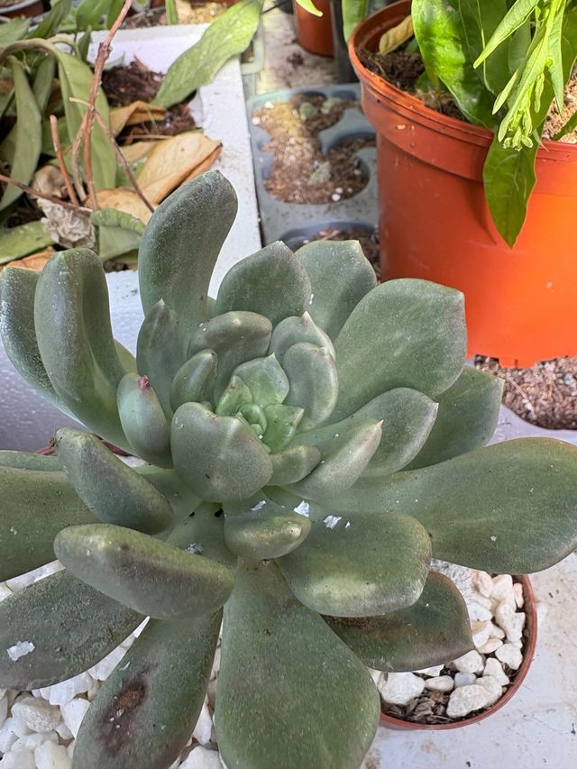 Planta suculenta Echeveria de hojas carnosas y forma de roseta. Ideal para coleccionistas. - Hojas de color verde grisáceo. - Cubierta de grava blanca en la maceta.