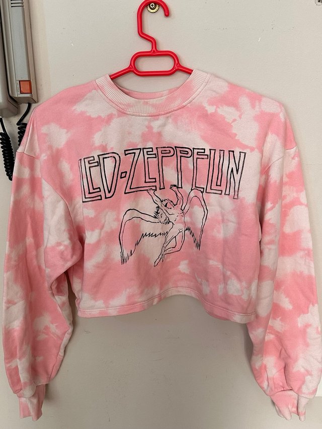 Sudadera corta con estampado tie-dye en tonos rosas y blancos. Presenta un diseño gráfico de Led Zeppelin en la parte delantera.