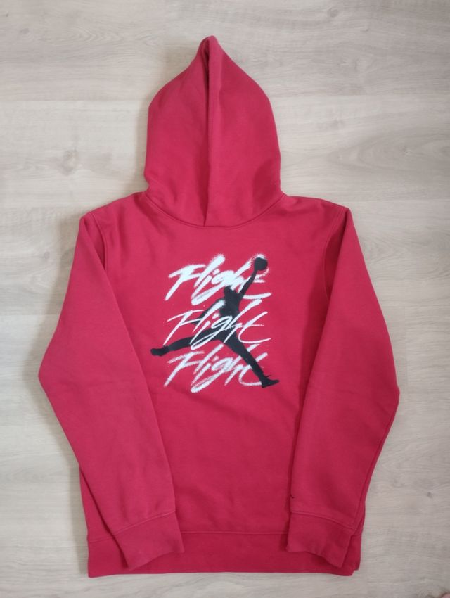 Sudadera con capucha de la marca Jordan en color rojo. Presenta un diseño gráfico llamativo en la parte frontal.