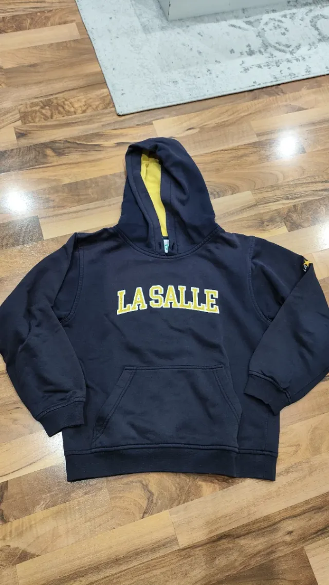Detalles del productoSudadera azul marino con capucha y bolsillo frontal, talla 10.