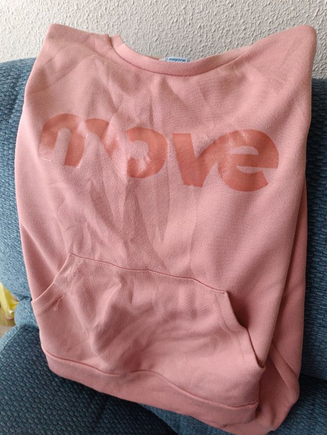 Sudadera rosa de Mayoral en talla 14. - Diseño con estampado move. - Bolsillo canguro delantero. - Cuello redondo.