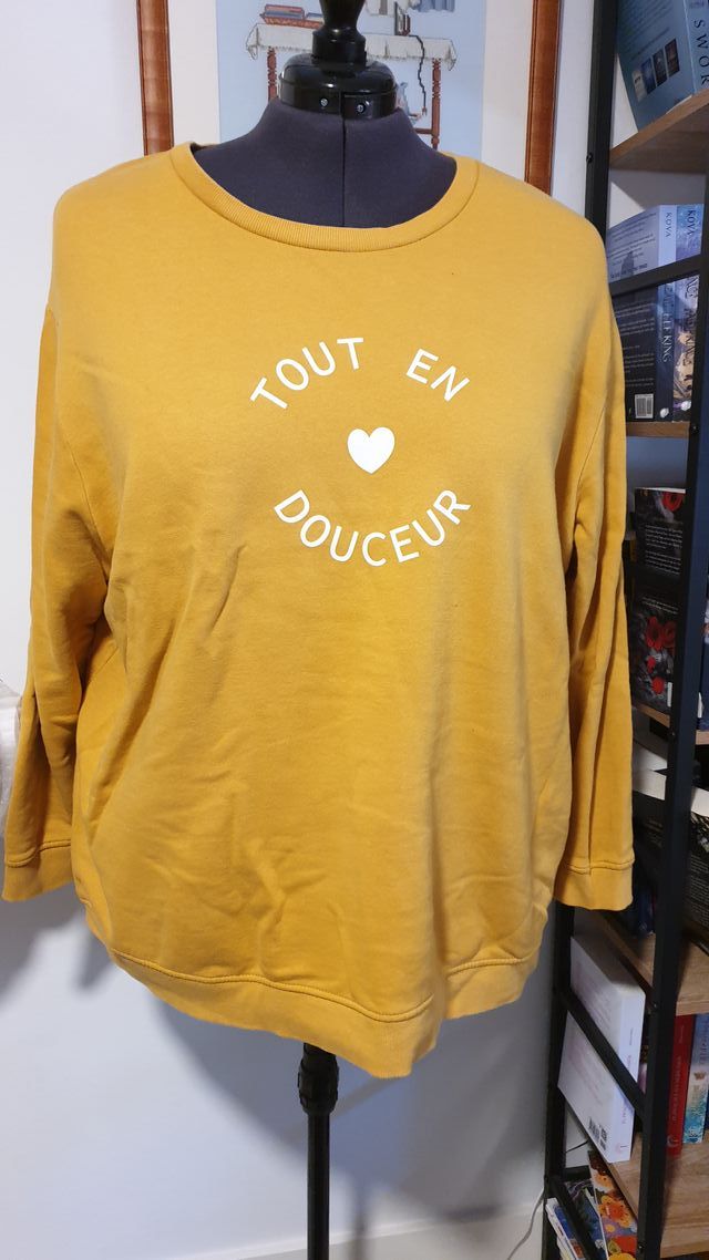 Sudadera color mostaza de Kiabi, talla 3XL (EUR 54-56), de algodón orgánico.