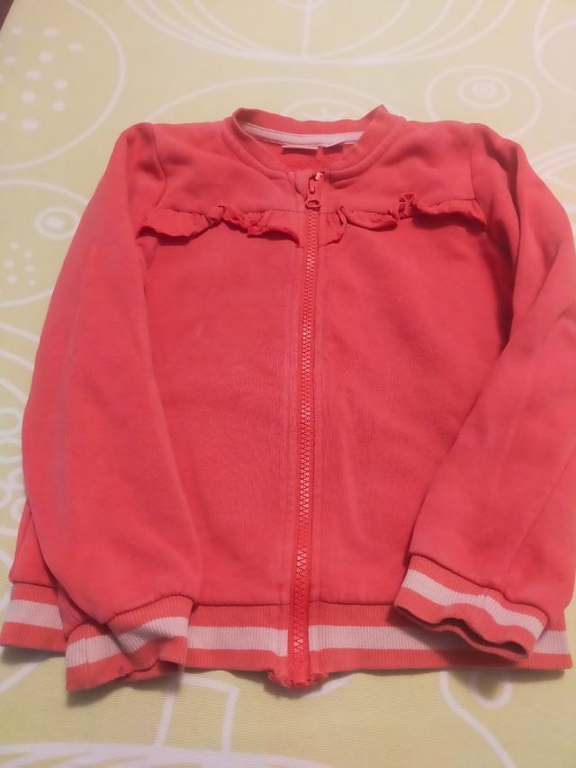 Detalles del productoSudadera de niña en color coral, ideal para entretiempo. Presenta un diseño con volantes en la parte delantera y puños y bajo elásticos.