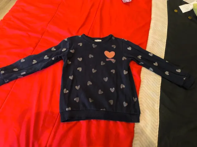 Detalles del productoSudadera azul marino para niña con estampado de corazones plateados y un corazón naranja más grande con el texto be mine.