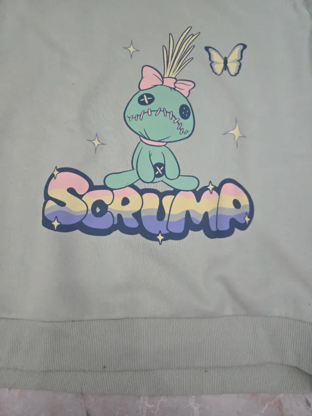 Sudadera de niña con un divertido diseño de Stitch. - Personaje de Stitch. - Estampado con el nombre SCRUMP en letras de colores. - Mariposa y estrellas decorativas.