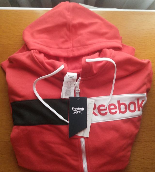 Original y sin estrenar, con etiquetas. La estrenas tú. Mira la etiqueta. Sudadera training con capucha Reebok Linear Hoodie Talla L de color rojo. Está hecha de cómoda felpa para que tu cuerpo se mantenga abrigado. Los bloques de color y el logo Reebok en el pecho le infunden un look deportivo. No te lo pienses. Está muy bien de precio!!.
