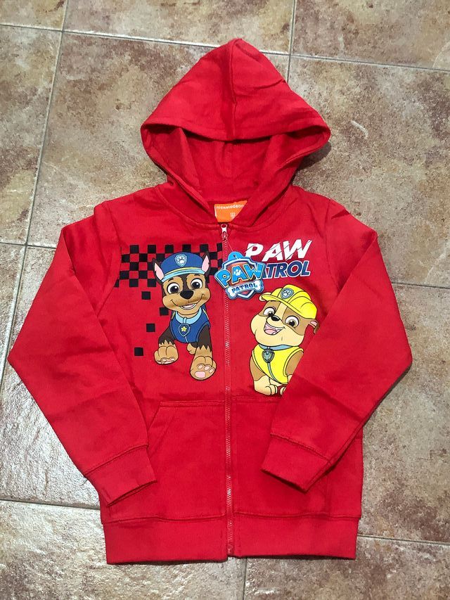 Detalles del productoSudadera original de licencia Nickelodeon. En color rojo y 100% algodón. Con capucha y cremallera. Serigrafía de la Patrulla Canina, con Chase y Rubble. Nueva, con etiquetas.