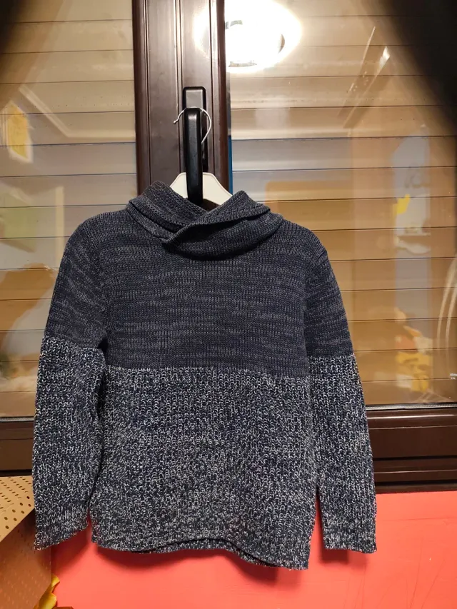 Sudadera de punto de la marca KIABI para niño. - Talla 6-7 años. - Diseño bicolor en gris y blanco jaspeado. - Cuello tipo shawl.