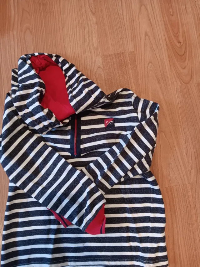 Detalles del productoSudadera de rayas con capucha y cremallera parcial.