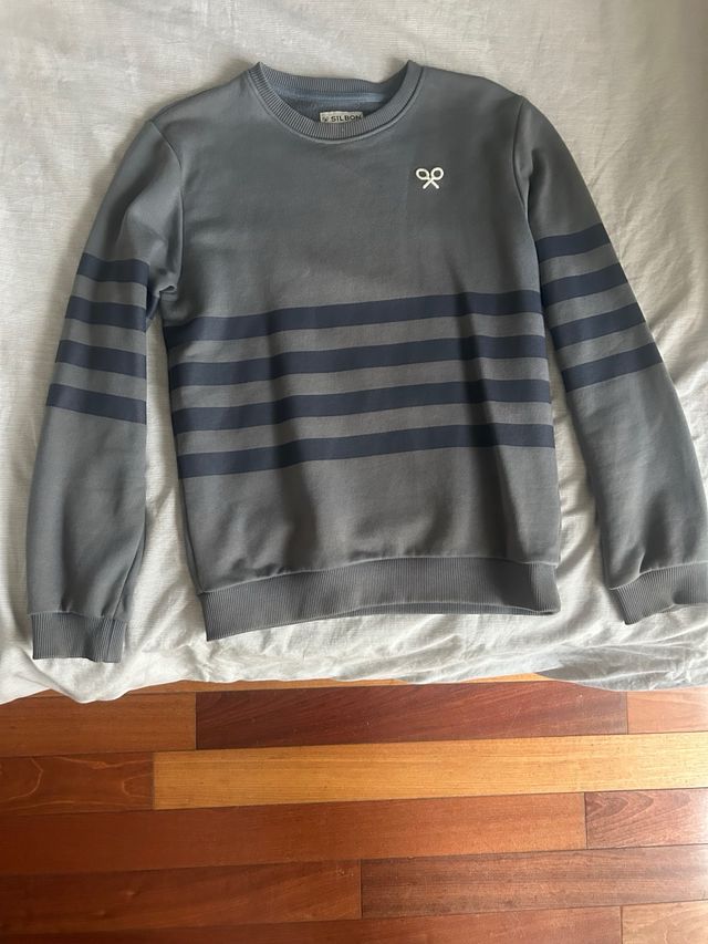 Sudadera gris con rayas azul marino de la marca Silbon, talla 14. Está en buen estado. - Diseño de rayas horizontales. - Logo bordado pequeño. - Tejido suave.