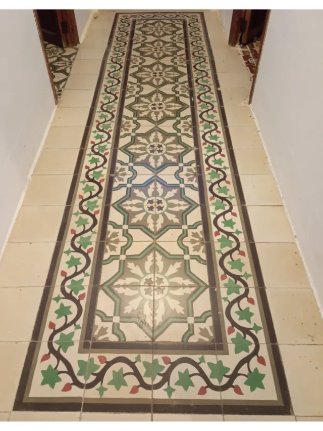 Detalles del productoSuelo hidráulico antiguo con un diseño geométrico y floral en tonos verdes, grises y morados. Los bordes están decorados con un patrón de enredaderas verdes y rojas.
