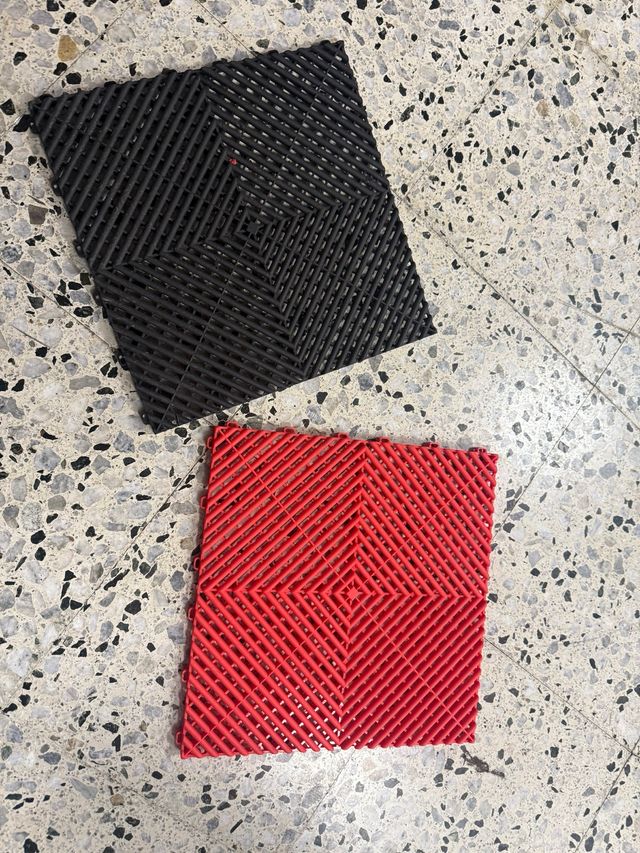 Detalles del productoPack de 240 baldosas, ideales para suelos de taller o garaje. 103 piezas son de color rojo y 137 de color negro.