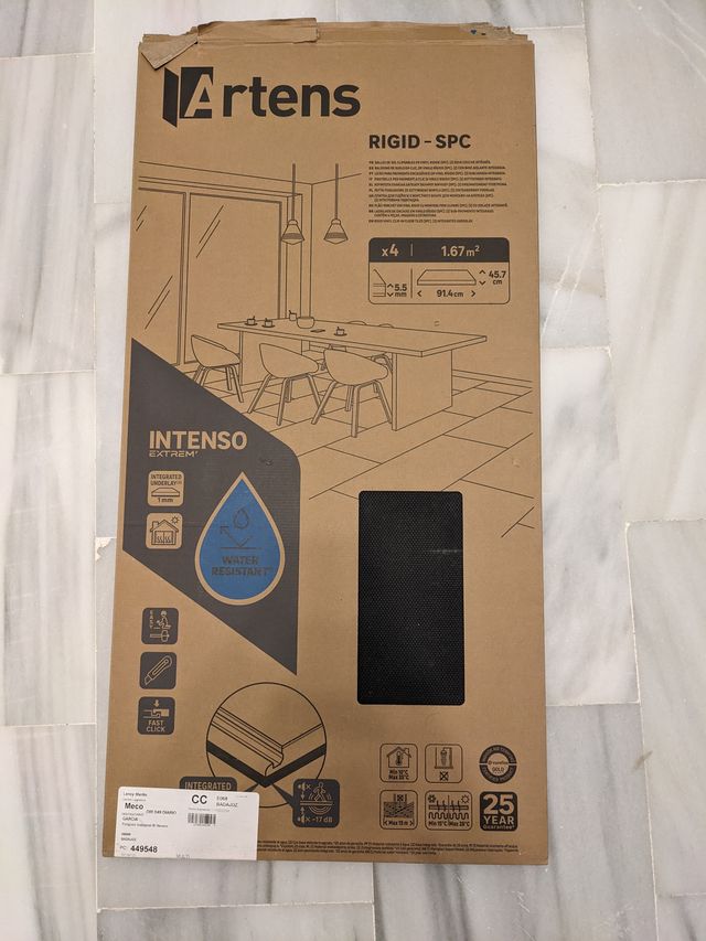 Detalles del producto2 paquetes de suelo vinílico Artens SPC Intenso en color gris oscuro. Cada paquete contiene 4 lamas que cubren 1.67 m².
