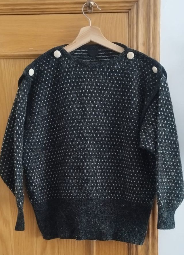 Precioso suéter de la marca Olga Santoni, talla XXL (equivalente a 44 o 16). Es de color gris plomo con detalles puntos blancos
