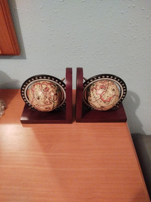 Detalles del productoPar de sujeta libros con forma de globo terráqueo. Son de madera oscura y tienen un diseño antiguo. Ideales para decorar una estantería o escritorio.
